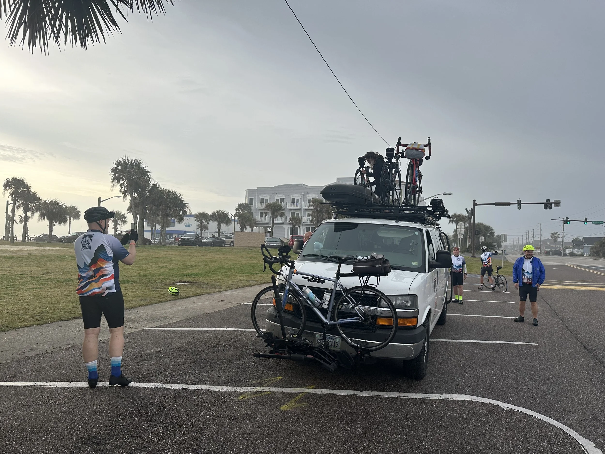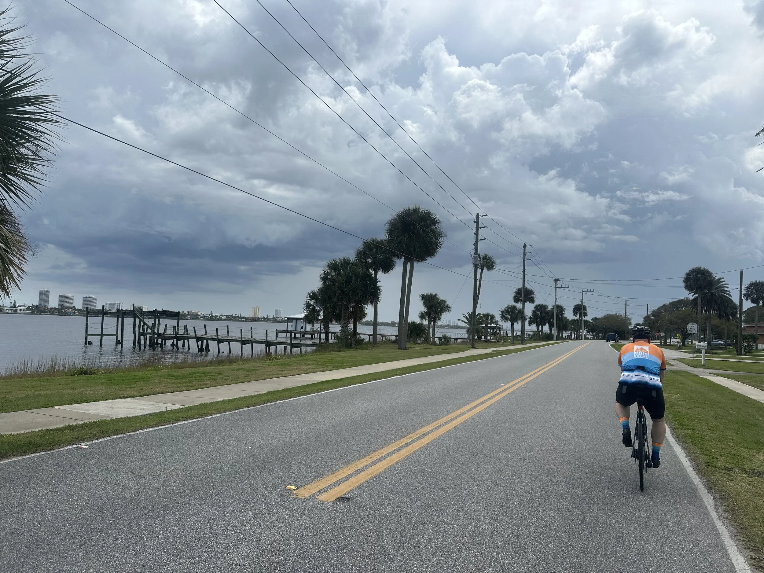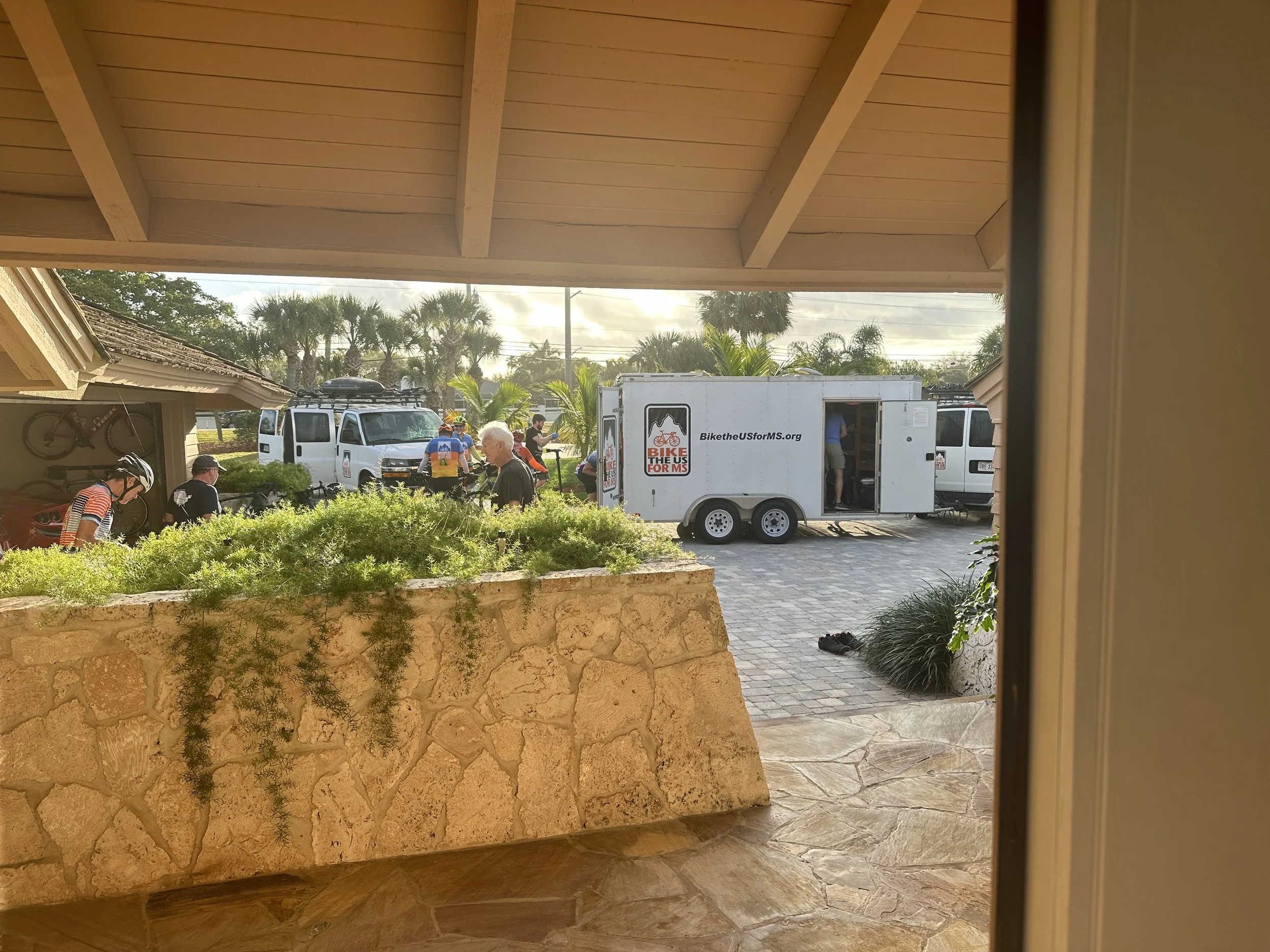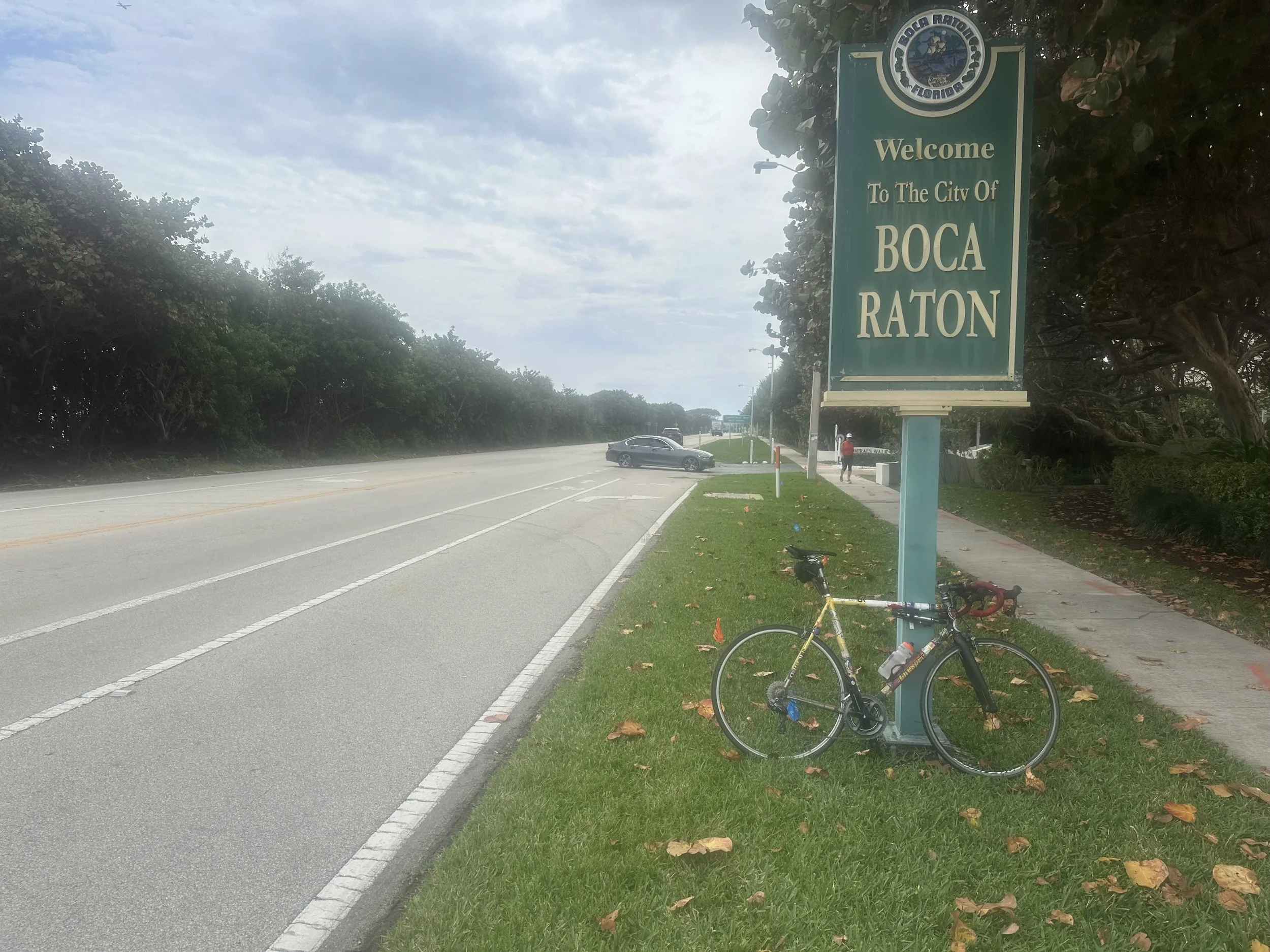 Another great day of cycling. I was on the struggle bus today; everything is starting to hurt, whether that’s because I’m 46 now or just out of shape; feet are swelling, lungs are tired. Back feels good though. We rode through the wealth areas of Palm Beach, but it rained almost all day, at times quite hard, so we really didn’t see much, and what we did see was hard to take a picture of. We actually rode right past Mar-A-Lago; you could tell because there were several camerapersons stationed on the bike path with their cameras pointing at it, to get B-roll, or in case the place exploded or something. You also could tell because there were several Secret Service stands set up to oversee the property; interestingly, they are quite clearly labeled with no attempt to hide them. I would have taken pictures but, again, it was raining pretty hard, which I’m going to choose to see as a good omen.
